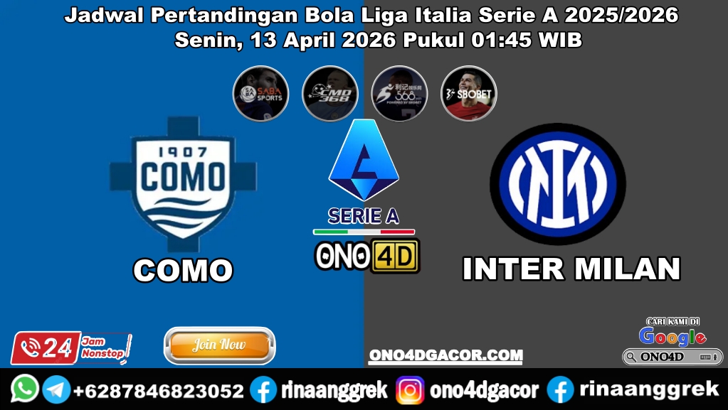 PREDIKSI BOLA bandithoki–Como vs Inter pada pekan ke-32 Serie A 2025-2026 akan digelar di Giuseppe Sinigaglia. Pertandingan Liga Italia ini dijadwalkan kick-off Senin, 13 April 2026, jam 01.45 WIB, live streaming di Vidio.