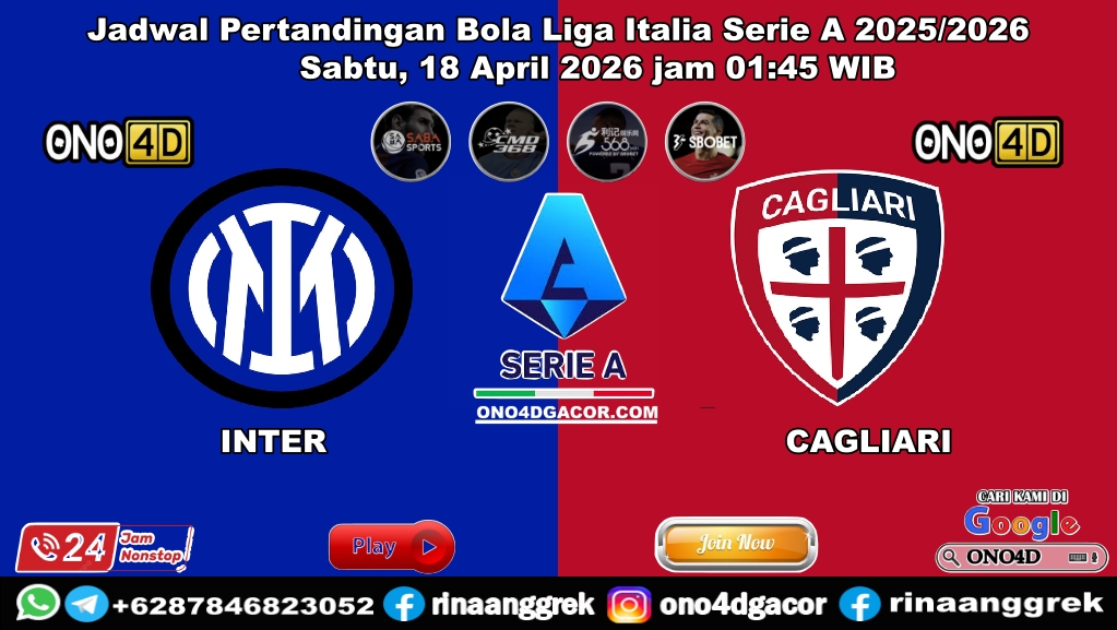 PREDIKSI BOLA bandithoki–Pertandingan Inter vs Cagliari pada pekan ke-33 Serie A 2025-2026 akan digelar di Giuseppe Meazza/San Siro. Pertandingan Liga Italia ini dijadwalkan kick-off Sabtu, 18 April 2026, jam 01.45 WIB, live streaming di Vidio.