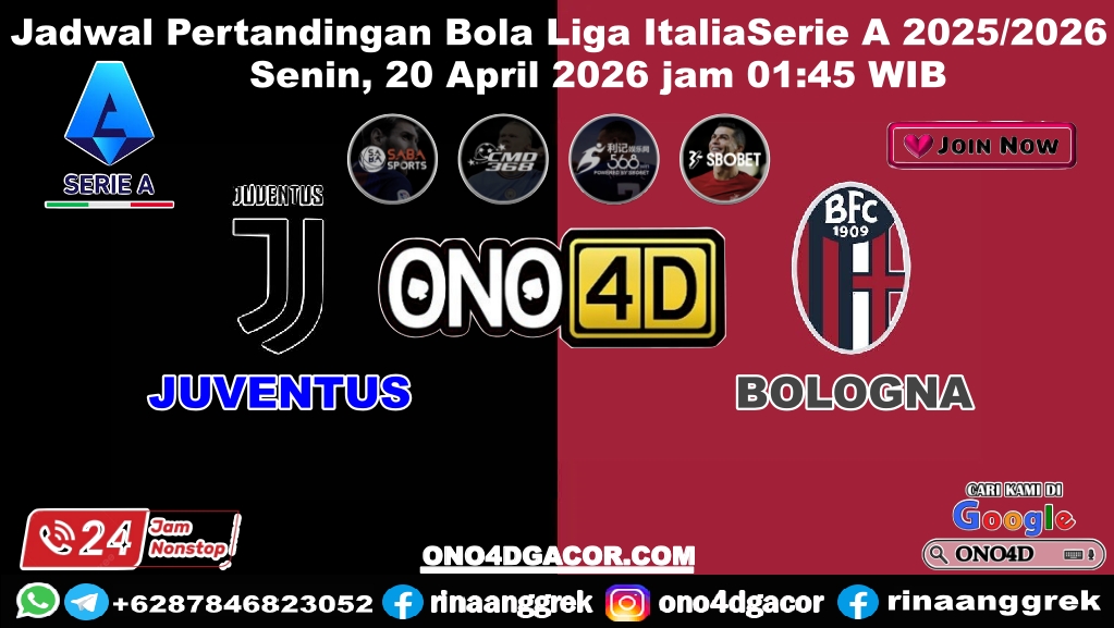 PREDIKSI BOLA bandithokiPertandingan Juventus vs Bologna pada pekan ke-33 Serie A 2025-2026 akan digelar di Allianz Stadium. Pertandingan Liga Italia ini dijadwalkan kick-off Senin, 20 April 2026, jam 01.45 WIB, live streaming di Vidio.